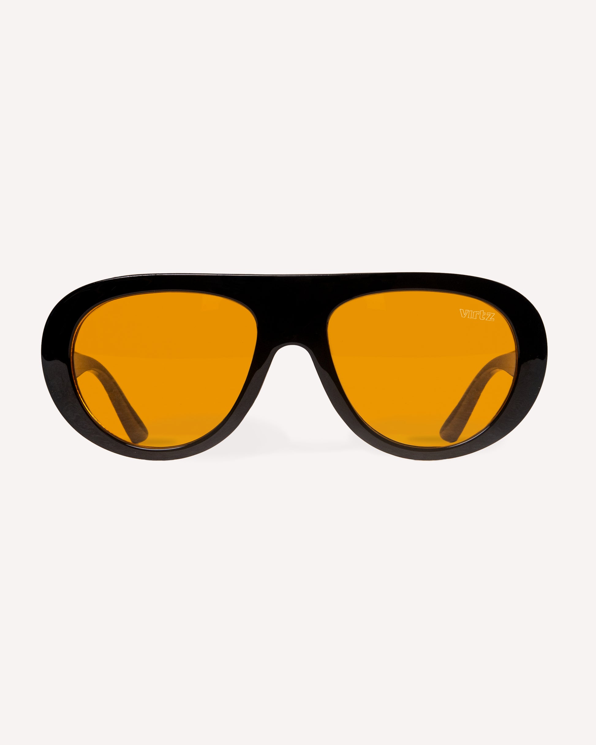 Amber — Black frame with striking amber lenses, bold and effortlessly stylish.